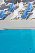 Garda, Włochy - września 2018: basen w Hotel Poiano, na obrzeżach miejscowości Garda nad jeziorem Garda, z odbicia parasole w wodzie stojącej.