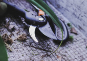 Przycinanie krzewów podczas słoneczny zimowy dzień, zbliżenie na ręce i motoryczna sekatora