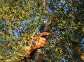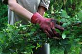 Przycinanie krzewów podczas słoneczny zimowy dzień, zbliżenie na ręce i motoryczna sekatora