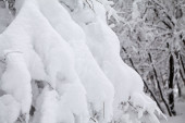 Drewno zimowe z pokrytymi śniegiem drzewami, naturalne tło