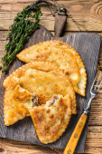 Zdjęcie "W domu Focaccia na drewnianym stole. Widok z boku, podłoże drewniane" może być wykorzystywane do celów osobistych i komercyjnych zgodnie z warunkami zakupionej licencji Royalty-free. Obraz jest dostępny do pobrania w jakości wysokiej rozdzielczości do 5760x3840.