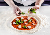 Cook ściera ser na domowe foccacia. Widok z góry, podłoże drewniane