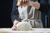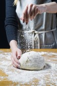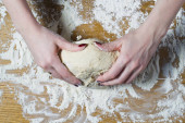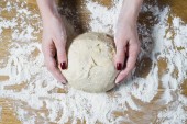 Szef kuchni ręce gotowania ciasta. Widok z góry, podłoże drewniane