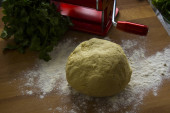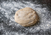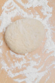 Ciasto drożdżowe na drewnianym stole posypane. Widok z góry, drewniane tła, miejsca na tekst