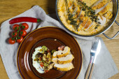Zdjęcie "Ozdoba pieczone piersi z kurczaka z kalafiorem i pora. Widok z boku, podłoże drewniane" może być wykorzystywane do celów osobistych i komercyjnych zgodnie z warunkami zakupionej licencji Royalty-free. Obraz jest dostępny do pobrania w jakości wysokiej rozdzielczości do 5760x3840.