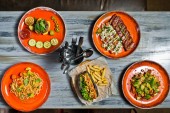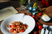 Ozdoba pieczone piersi z kurczaka z kalafiorem i pora. Widok z boku, podłoże drewniane