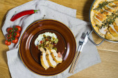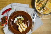Ozdoba pieczone piersi z kurczaka z kalafiorem i pora. Widok z boku, podłoże drewniane