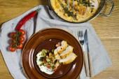 Ozdoba pieczone piersi z kurczaka z kalafiorem i pora. Widok z góry, podłoże drewniane