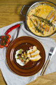Zdjęcie "Ozdoba pieczone piersi z kurczaka z kalafiorem i pora. Widok z góry, podłoże drewniane" może być wykorzystywane do celów osobistych i komercyjnych zgodnie z warunkami zakupionej licencji Royalty-free. Obraz jest dostępny do pobrania w jakości wysokiej rozdzielczości do 5760x3840.