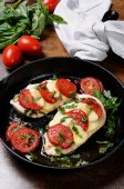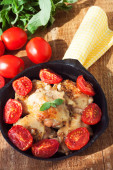 Patelnia z pieczone i pokrojone piersi z kurczaka. Tle kuchnia, widok z boku