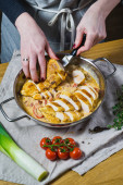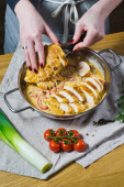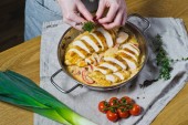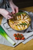 Patelnia z pieczone i pokrojone piersi z kurczaka. Tle kuchnia, widok z boku