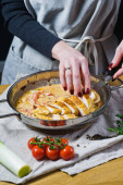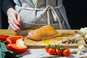 Zdjęcie "Szef kuchni stawia nacięcie piersi z kurczaka na patelni. Tle kuchnia, widok z boku" może być wykorzystywane do celów osobistych i komercyjnych zgodnie z warunkami zakupionej licencji Royalty-free. Obraz jest dostępny do pobrania w jakości wysokiej rozdzielczości do 5760x3840.