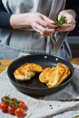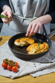 Szef kuchni stawia nacięcie piersi z kurczaka na patelni. Tle kuchnia, widok z boku