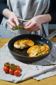Szef kuchni stawia nacięcie piersi z kurczaka na patelni. Tle kuchnia, widok z boku