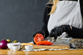 Zdjęcie "Szef kuchni tnie porów na drewniana deska do krojenia. Tle kuchnia, widok z boku" może być wykorzystywane do celów osobistych i komercyjnych zgodnie z warunkami zakupionej licencji Royalty-free. Obraz jest dostępny do pobrania w jakości wysokiej rozdzielczości do 5760x3840.