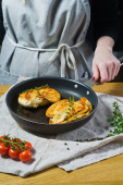 Szef kuchni kropi tymianek na piersi z kurczaka na patelni. Tle kuchnia, widok z boku