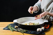 Szef kuchni stawia posiekane czerwone papryki i cebuli z nożem na patelni. Tle kuchnia, widok z boku