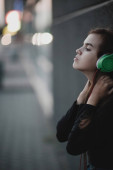 Ruda młoda suczka z portret mobilne słuchawki przez szkło