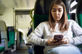 Pociąg pozytywny Ruda młoda suczka z telefonu komórkowego w metrze