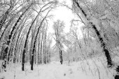 Śnieg krajobraz w parku. Obiektyw typu rybie oko efekty