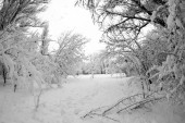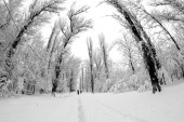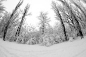 Śnieg krajobraz w parku. Obiektyw typu rybie oko efekty