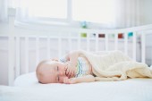Zdjęcie "Adorable córeczka śpiące w łóżeczku niemowlęcym współ-sleeper dołączone do łóżka rodziców. O dzień nap w łóżeczko małe dziecko. Koncepcja szkoleń snu. Niemowlę noworodek w słoneczne przedszkole" może być wykorzystywane do celów osobistych i komercyjnych zgodnie z warunkami zakupionej licencji Royalty-free. Obraz jest dostępny do pobrania w jakości wysokiej rozdzielczości do 5760x3840.