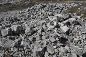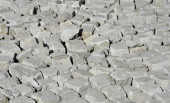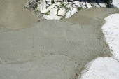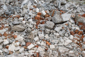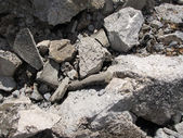 Fragmenty płyt betonowych, w postaci dużych szarych kamieni z wystające zbrojenie. Tło.
