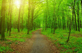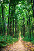 Kolorowy szlak ścieżka w zielonych lasów liściastych w słońcu na zachód słońca, krajobraz las
