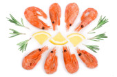 Czerwony gotowane krewetki i krewetki z rozmarynem i cytryny kromka na białym tle. Widok z góry. Leżał z płaskim