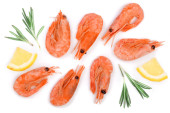 Zdjęcie "Czerwony gotowane krewetki i krewetki z rozmarynem i cytryny kromka na białym tle. Widok z góry. Leżał z płaskim" może być wykorzystywane do celów osobistych i komercyjnych zgodnie z warunkami zakupionej licencji Royalty-free. Obraz jest dostępny do pobrania w jakości wysokiej rozdzielczości do 5760x3840.