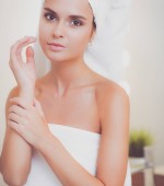 Młoda atrakcyjna kobieta stojąc przed lustrem w łazience