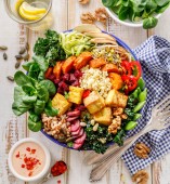 Zdjęcie "Budda miska z mieszanych warzyw, sera tofu i kasze. Wegańskie zdrowy i Pożywny posiłek. Zdrowe jedzenie koncepcja" może być wykorzystywane do celów osobistych i komercyjnych zgodnie z warunkami zakupionej licencji Royalty-free. Obraz jest dostępny do pobrania w jakości wysokiej rozdzielczości do 5760x3840.