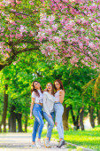 pozowanie w pobliżu kwitnące kwiaty wiśni sakura podczas wiosny podróży szczęśliwy przyjaciół. lato wakacje wycieczka na Japonii, Korei, Tajwanu z dziewczyna