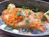 Tradycyjny rosół rosyjski w misce na drewnianym stole z domu Pizza z pomidorów, papryki i oliwek