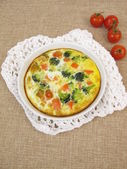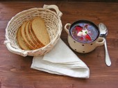 Tradycyjny rosół rosyjski w misce na drewnianym stole z domu wegańskie kalafior Crust Pizza ze szpinakiem i oliwek widok płaski
