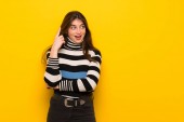 Młoda kobieta na żółte ściany, mając wątpliwości patrząc