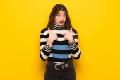 Zdjęcie "Młoda kobieta na żółte ściany trzymając miejsce wyobraźni na dłoni do wstawienia reklamy" może być wykorzystywane do celów osobistych i komercyjnych zgodnie z warunkami zakupionej licencji Royalty-free. Obraz jest dostępny do pobrania w jakości wysokiej rozdzielczości do 5760x3840.