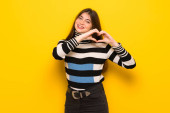 Młoda kobieta na żółte ściany trzymając miejsce wyobraźni na dłoni do wstawienia reklamy
