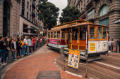 Zdjęcie "San Francisco, Stany Zjednoczone Ameryki. 18 lipca 2018 r. Tradycyjny klasyczny kolejki linowej w San Francisco w górę iw dół wzgórza." może być wykorzystywane do celów osobistych i komercyjnych zgodnie z warunkami zakupionej licencji Royalty-free. Obraz jest dostępny do pobrania w jakości wysokiej rozdzielczości do 5760x3840.