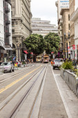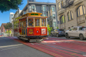 San Francisco, Stany Zjednoczone Ameryki. 18 lipca 2018 r. Tradycyjny klasyczny kolejki linowej w San Francisco w górę iw dół wzgórza.