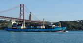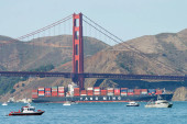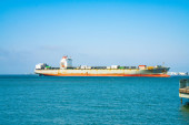 San Francisco, Stany Zjednoczone Ameryki. 15 maja 2018 r. Ogromny ładunek statku przekazując miasto San Francisco wprowadzanie zatoki. Widok z wybrzeża.
