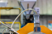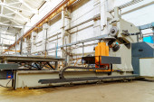 Industrialu z części metalowe produkowane w branży metalowej. Sprzęt do cięcia metalu wewnątrz zakładu.