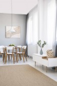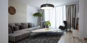 Projektowanie wnętrz beżowy szary i biały salon z narożną sofą i dwoma stoliki kawowe