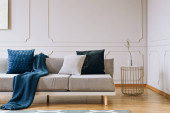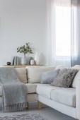 Poduszki i koc na kanapie Wygodny narożnik beżowy w elegancki salon