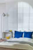 Lampa na stołku obok łóżka w biały minimalny sypialnia wnętrza z plakatów. Prawdziwe zdjęcie