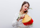 Kobieta z białych róż przytrzymanie pudełko kształt serca.