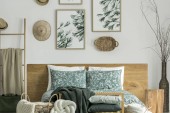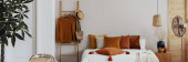 Brązowy i pomarańczowy poduszki na białe łóżko w naturalnych sypialnia wnętrza z wikliny lampa i drewniany stolik z wazon