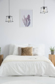 Zdjęcie "Węzeł żółty poduszkę na białe łóżko w sypialni jasny z kopia miejsce na pustej ścianie biały" może być wykorzystywane do celów osobistych i komercyjnych zgodnie z warunkami zakupionej licencji Royalty-free. Obraz jest dostępny do pobrania w jakości wysokiej rozdzielczości do 5760x3840.
