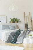 Węzeł żółty poduszkę na białe łóżko w sypialni jasny z kopia miejsce na pustej ścianie biały