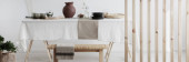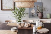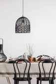 Rattan Lampa nad stołem z wikliny plateau i czarne szklane płytki i stylowa metalowa Latarenka, miejsce na pustej ścianie biały